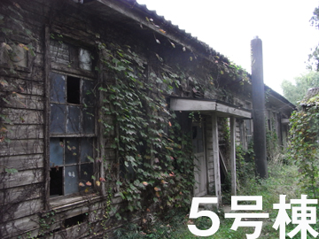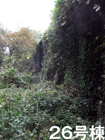 26号棟も同様の目的で使用された建物だがロープが張られ、入ることができない。ここにも大きな蜘蛛の巣。裏口に回るとツタ。いまどきこんな老朽化した建物は珍しい。